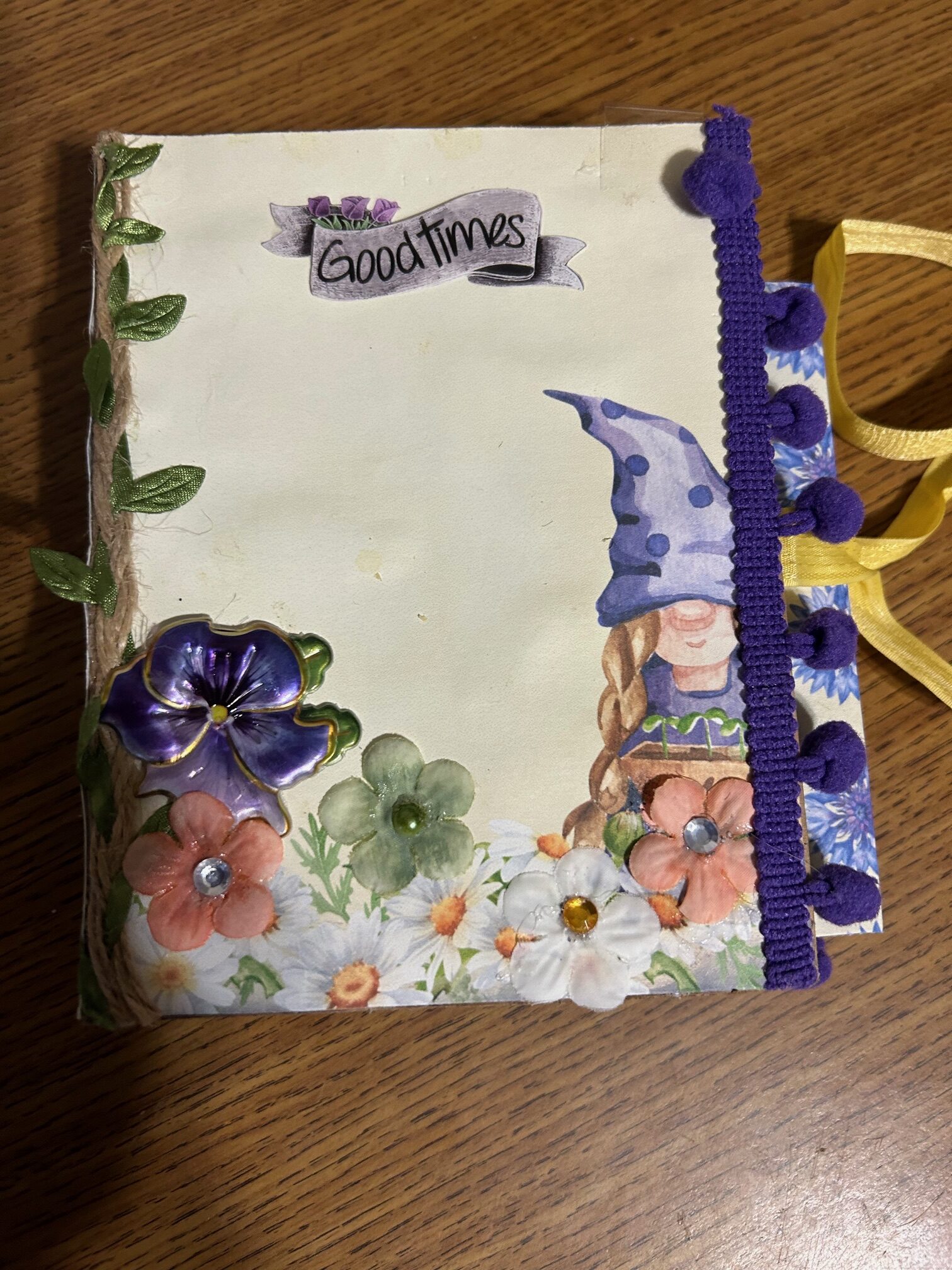 Capture your memories in this delightful Good Times Knome Paperbag Journal, measuring 5 x 6 inches. It includes 18 pages filled with pockets, inserts, and tags for all your creative journaling. The journal is tied with a thin yellow ribbon closure and features flowers and leaves adorning the binding, adding a touch of whimsy and charm to your keepsakes.